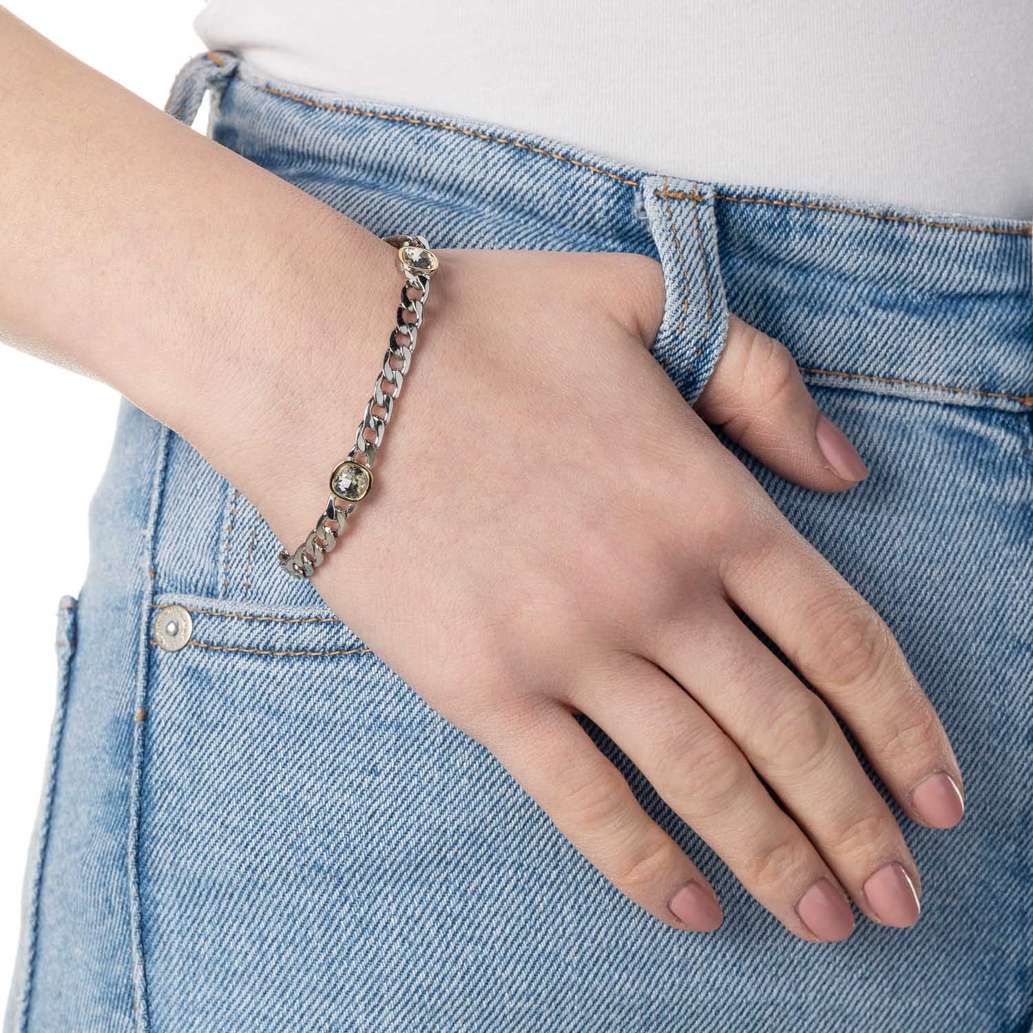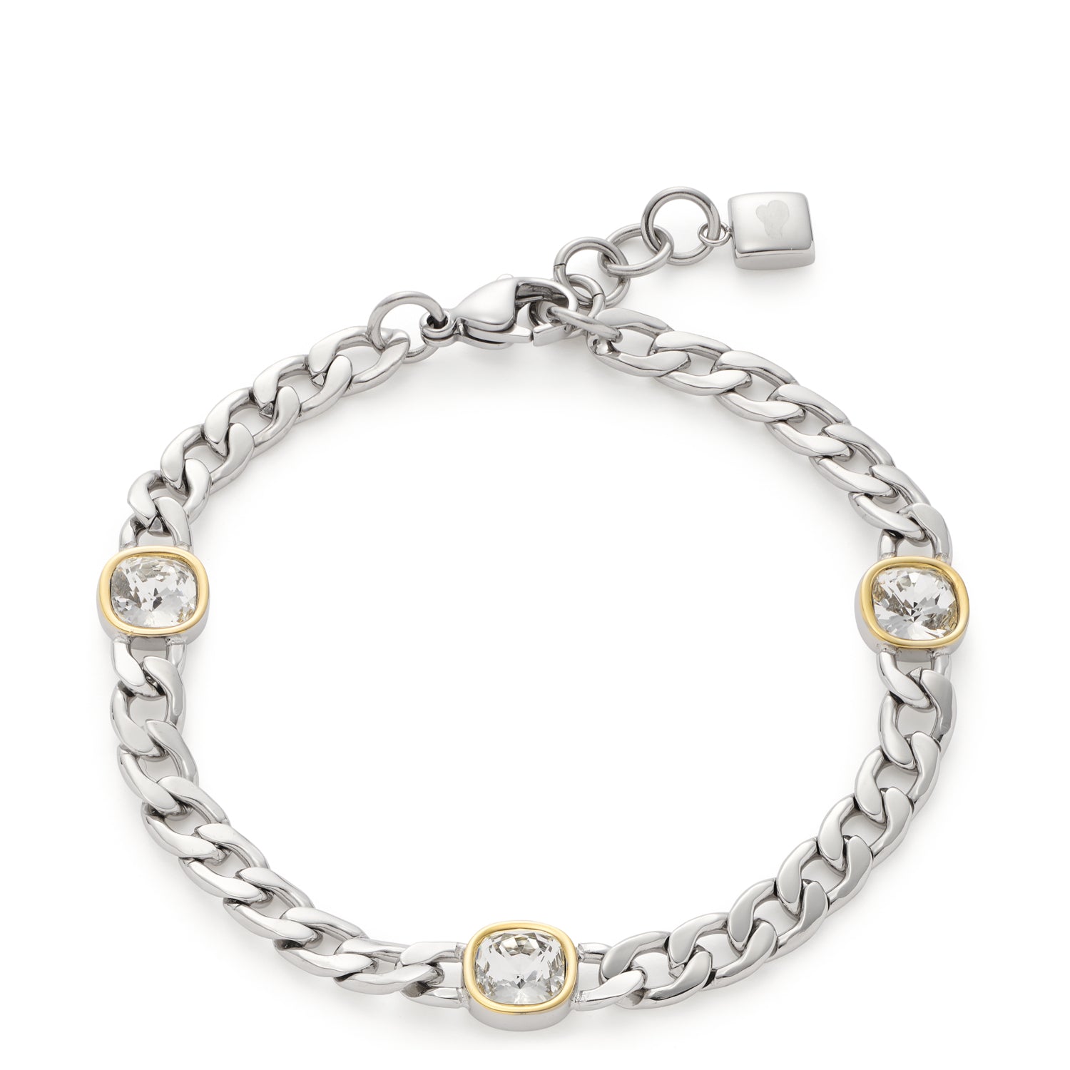 Drei quadratisch geformte Glassteine mit facettierter Oberfläche, eingefasst von einem golden ionenplattierten Edelstahlrahmen, werden von einer opulenten Panzerkette gehalten, die jedem femininen Handgelenk ungemein schmeichelt.
