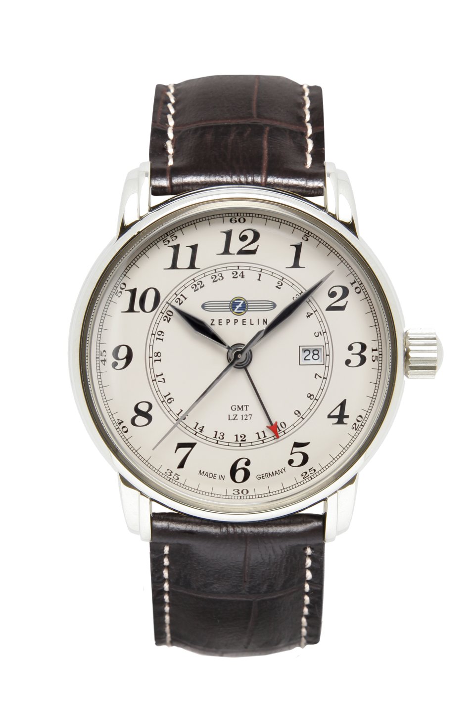 Mit dem frei einstellbaren 24h-Zeiger lässt sich bei der ZEPPELIN „LZ127 Graf Zeppelin“ GMT die Uhrzeit in einer zweiten Zeitzone verfolgen – nicht nur für Vielreisende eine nützliche Zusatzfunktion, sondern auch eine Hommage an die große Zeit der Reisen in ferne Länder mit dem Zeppelin Luftschiff. An eben jene Epoche ist auch das Design angelehnt, mit einem gewölbten, beigen Zifferblatt, erhaben lackierten Ziffern, den klassischen Schwert-Zeigern aus der Welt der Fliegeruhren und einem edlen Lederarmband aus deutscher Produktion, auf das in Handarbeit ein täuschend echt aussehendes Kroko-Muster eingeprägt ist. Im polierten Edelstahl-Gehäuse mit kratzfestem K1-Sicherheitsglas ist ein unkompliziertes, zuverlässiges Schweizer Quarzwerk verbaut.